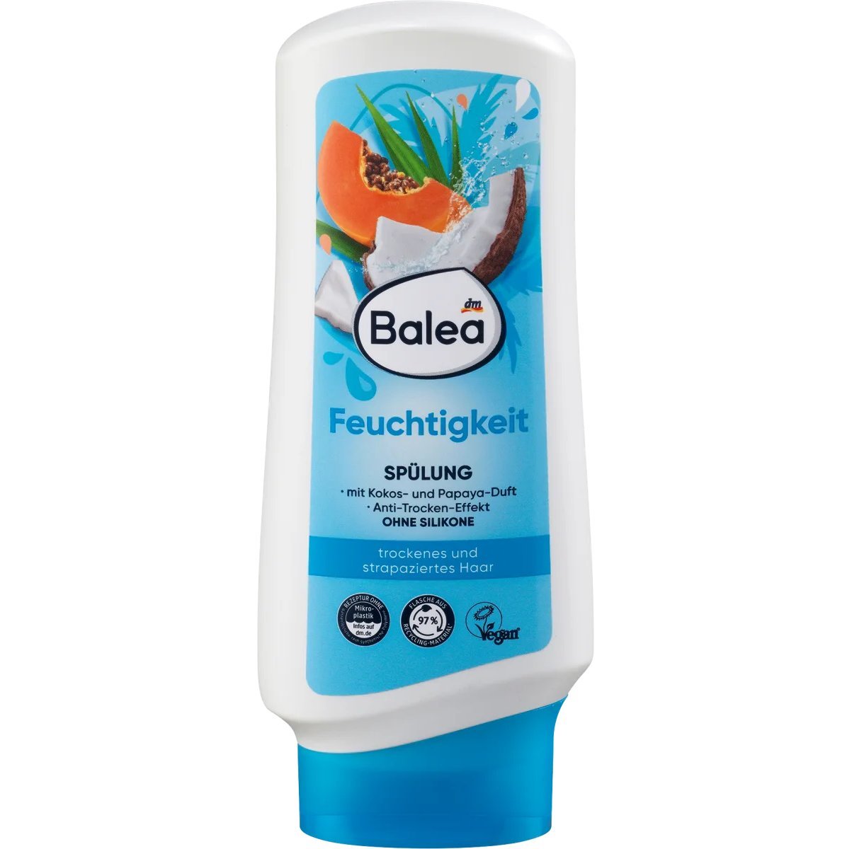 L’après-shampoing Balea nourrit intensément les cheveux, les laissant doux et soyeux. Il leur confère un parfum frais de noix de coco et de papaye et les enrichit en vitamine B3 et provitamine B5. Sa formule végane apporte une brillance saine aux cheveux, jusqu’aux pointes. Elle est sans microplastiques ni polymères synthétiques hydrosolubles.